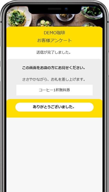 お店様専用のQRコードをご用意しております。QRコードをお渡しいただき、お客様のスマートフォンよりアンケートページを読みこんでいただきます。