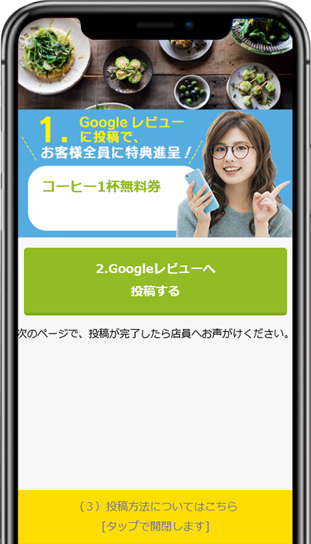 Googleレビューへの投稿方法も掲載しておりますので、忙しい時間帯に店舗スタッフの手を煩わす事もございません。 効率的に評価の高い口コミ(Googleレビュー)を集めることができ、集客の効果が大きくなります。